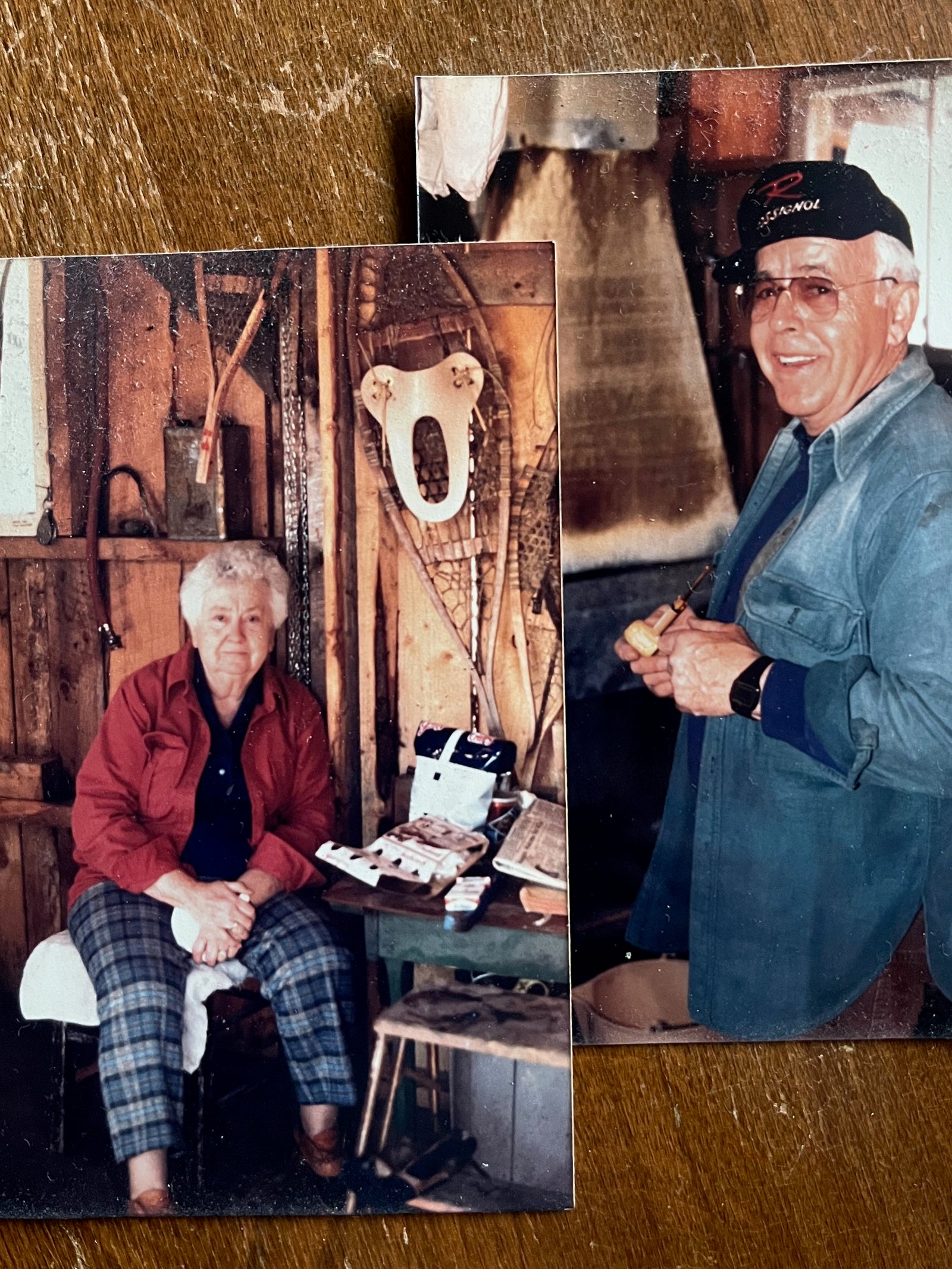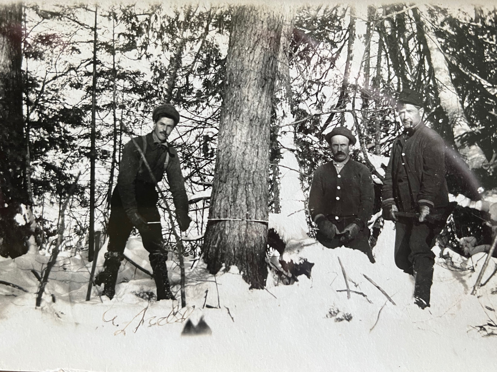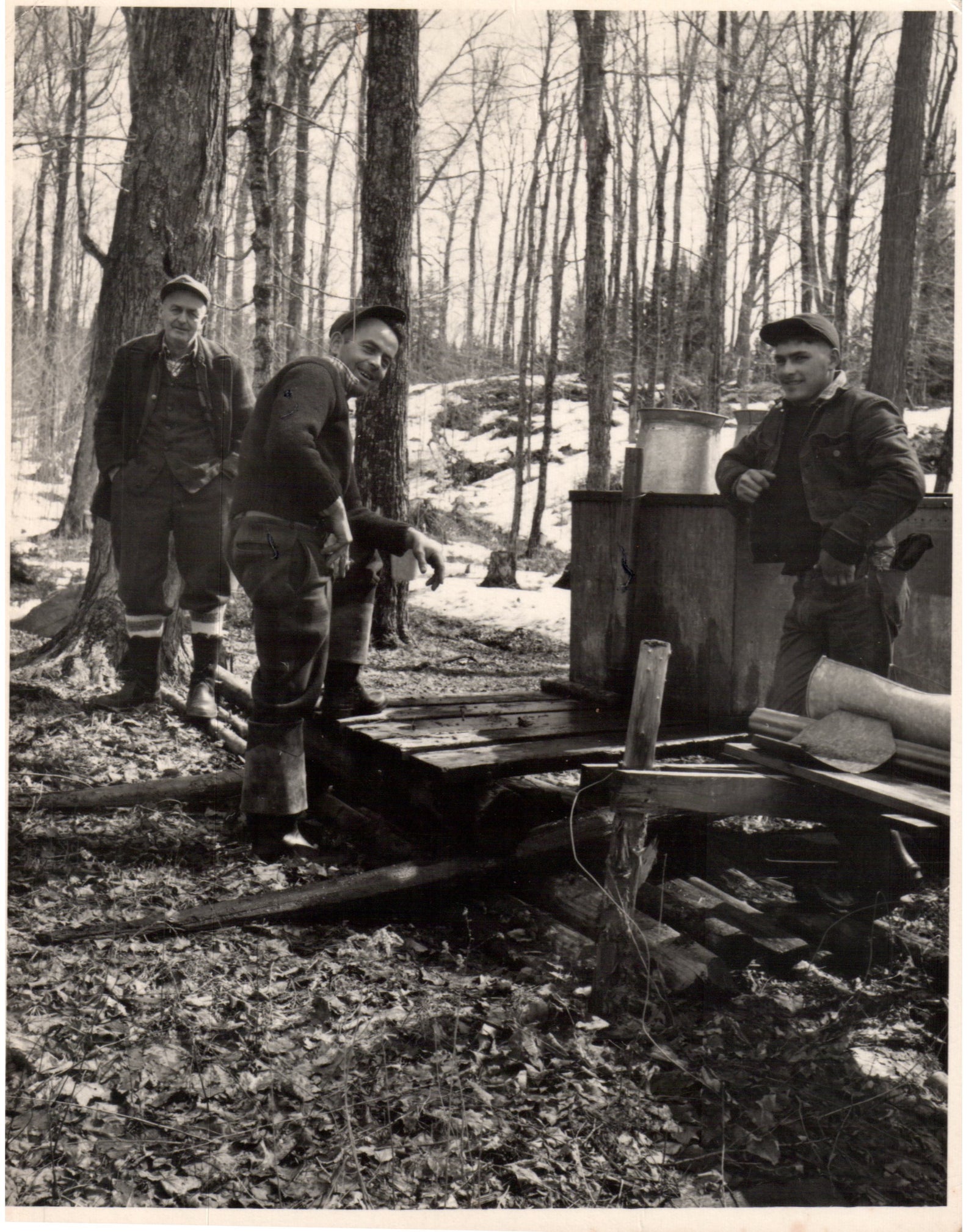 Jim's sugaring heritage spans four generations in Morgan. The photo on the left shows Jim's grandfather, Alansford as a young man working with Alansford's stepfather, Bert and a hired man in the woods. The photo in the center shows Alansford (on left) Jim's father, Bert (in center) and a hired man, Roger unloading sap in Morgan. The photo on the right shows Jim's parents, Alice and Bert in the sugarhouse that was near their house.